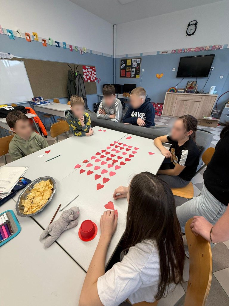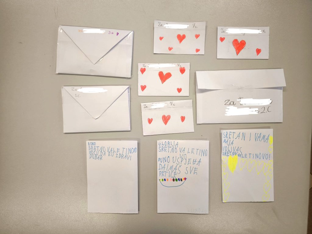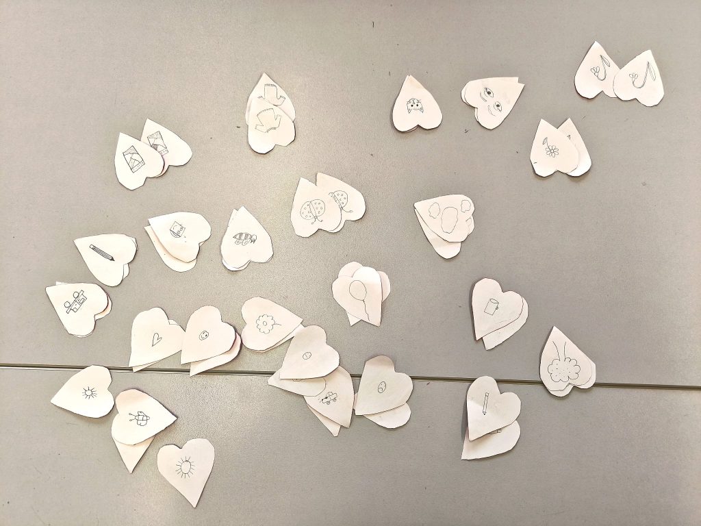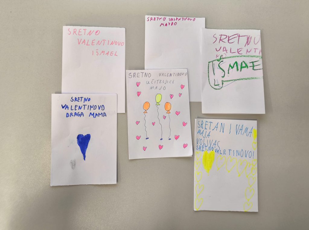 Ovaj smo tjedan imali radionicu na temu Valentinova, a korisnici su izrađivali srca od papira i na internetu smo našli ideju za društvenu igru s tim srcima, a onda smo okrenuli srca i napravili vlastiti Memory s motivima koje smo sami nacrtali olovkom (npr. pčele, oblaci, bubamare, sunca i sl.). Na kraju su se izrađivale čestitke za Valentinovo.