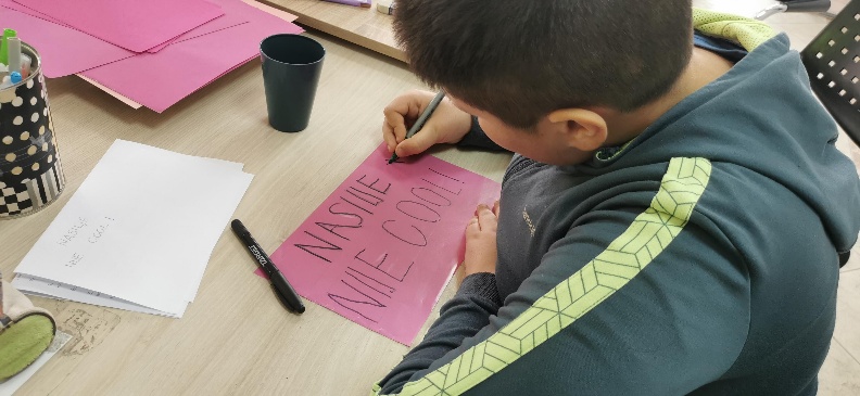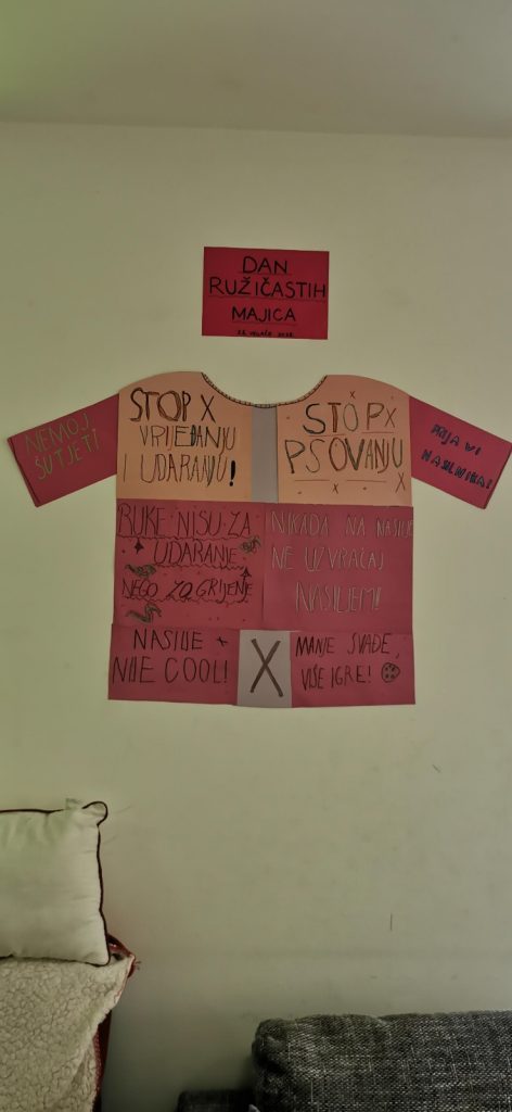 U srijedu, 25. veljače, obilježili smo dan Dana ružičastih majica. S ciljem promoviranja prijateljstva i ljubaznosti te borbe protiv svih vrsta bullyinga kao što su ogovaranje, izbjegavanje, cyber zločestoće, udaranje, čupkanje te tuča i ružne riječi, izradili smo veliku ružičastu majicu s prigodnim i ohrabrujućim porukama kojima smo jasno dali do znanja da vršnjačkom nasilju nije mjesto u našem poludnevnom boravku.