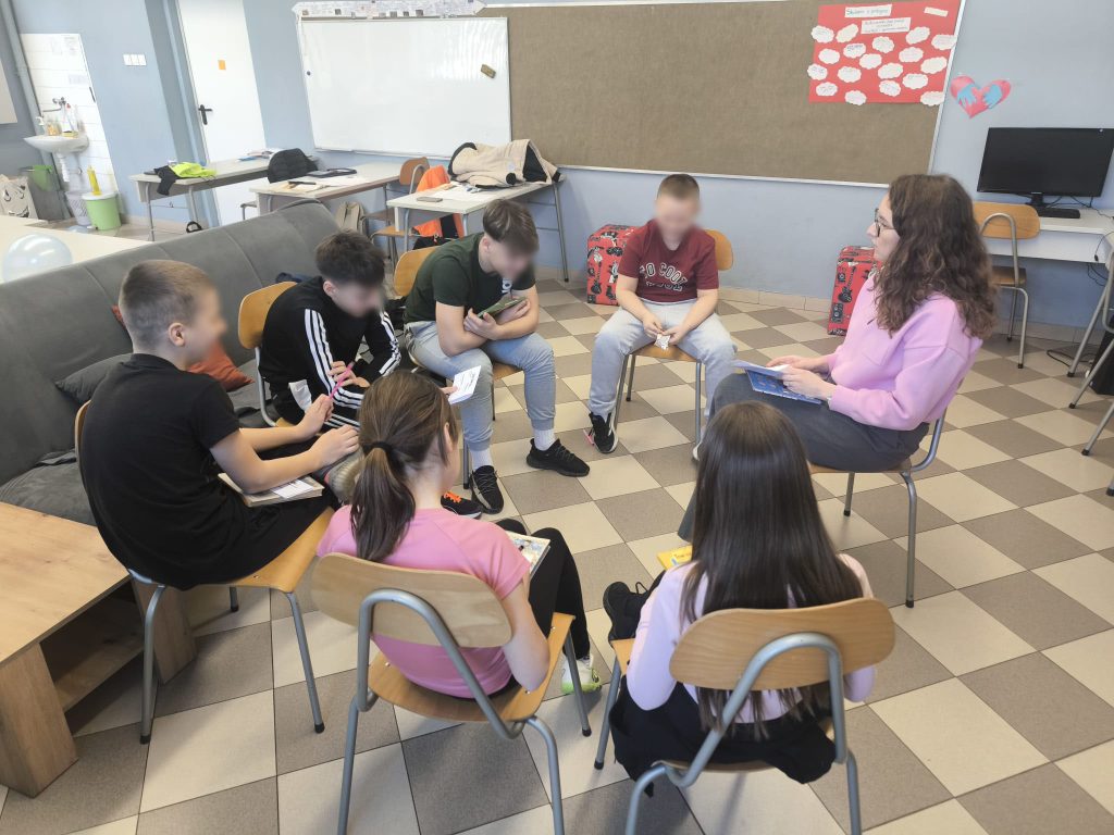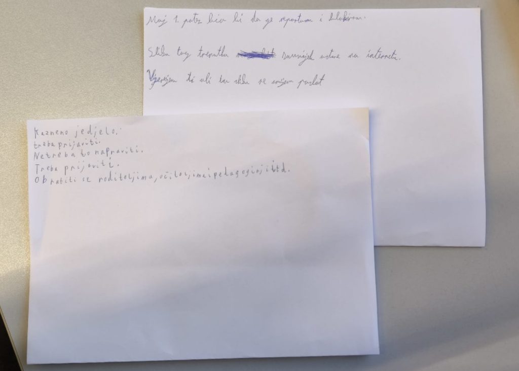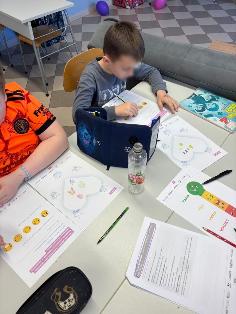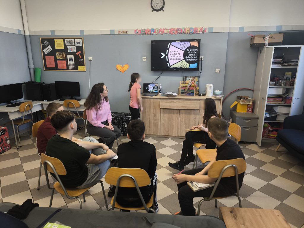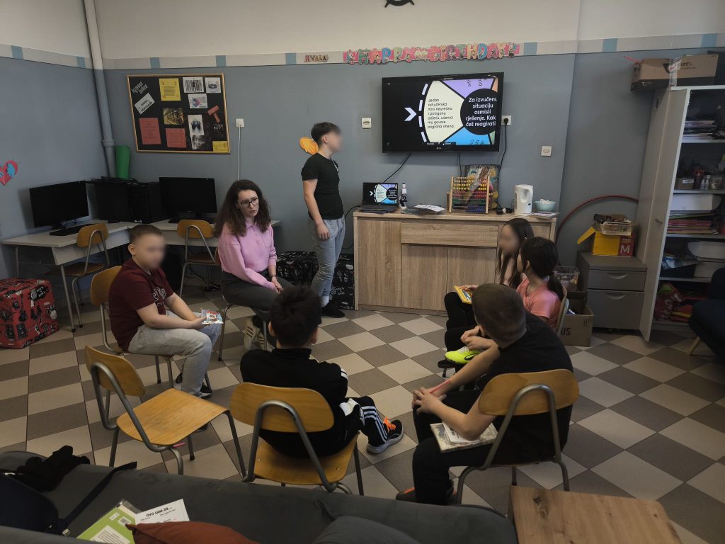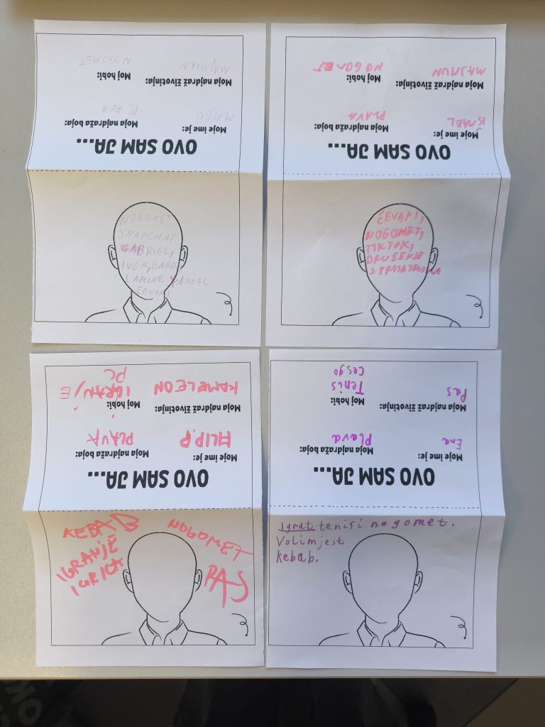 Radionica je bila usmjerena na poticanje empatije, prijateljstva i nenasilnog ponašanja među korisnicima i vršnjacima općenito. Kroz Krug povjerenja razgovarali smo o tome što znači biti dobar prijatelj i kako reagirati kada primijetimo da je netko tužan ili isključen, dok su korisnici putem aktivnosti Kotač situacija promišljali i predlagali rješenja za različite svakodnevne izazove poput ruganja, širenja ružnih poruka ili dolaska nove osobe u razred. Radionicu smo završili izradom osobne iskaznice, čime su korisnici imali priliku predstaviti sebe, svoje interese i osobine te dodatno osnažiti međusobno upoznavanje i prihvaćanje različitosti.