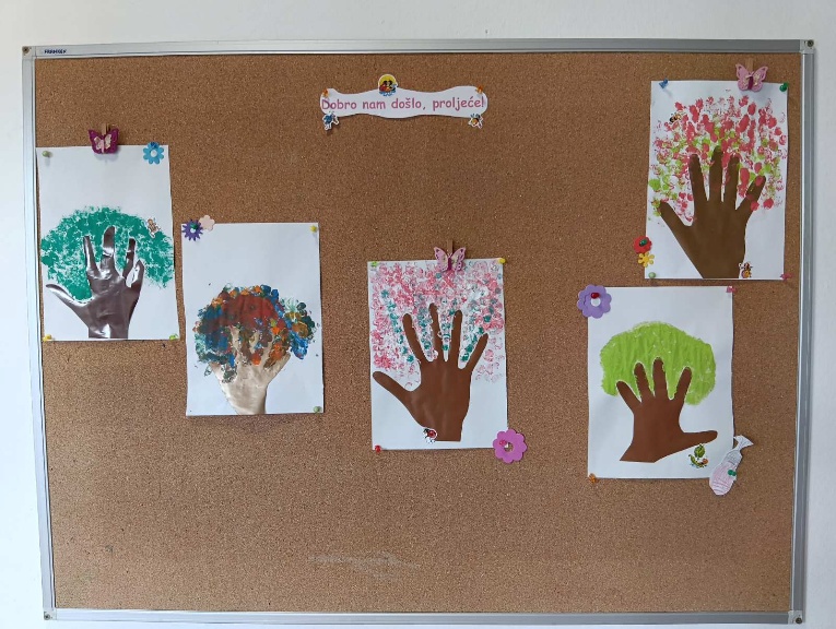 U susret proljeću održali smo kreativnu radionicu. Kroz igru, korisnici su obrisom svojih ruku izrezivali kolaž papir te su prstima, uz pomoć tempera, oslikavali krošnje drveća. Vlastitim odabirom boja i strpljivim tapkanjem korisnici su stvarali šareno lišće i cvjetove, vježbali finu motoriku i razvijali svoju kreativnost i maštu.