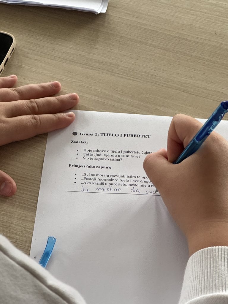 Sa djecom starijeg uzrasta proveli smo radionicu “Spolno zdravlje – razbij mitove znanjem” gdje su anonimno na papiriće ispisali sva pitanja koja ih zanimaju te ih ubacili u jednu kutiju.