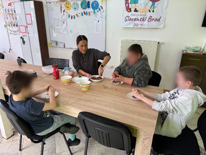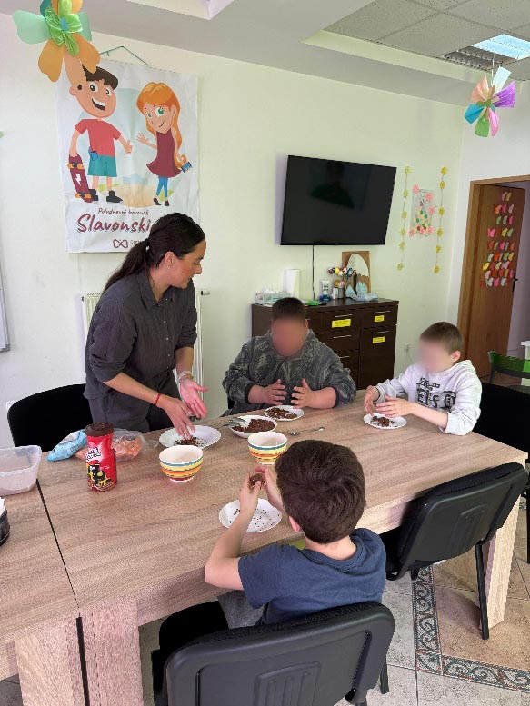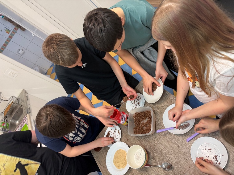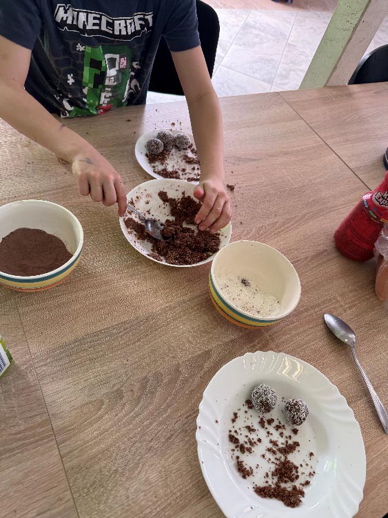 Nakon upoznavanja sa sastojcima, pripremili smo smjesu od mljevenog keksa, kakaa, šećera i maslaca. S velikim veseljem oblikovali smo kuglice te ih ukrašavali prema vlastitom izboru koristeći kokos, čokoladne mrvice i druge dodatke.
